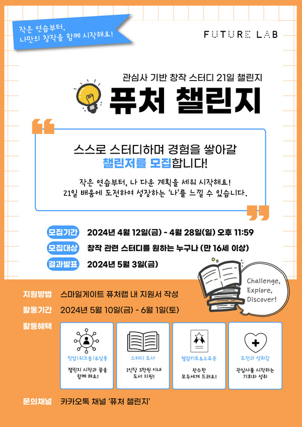 퓨처랩 황주훈 팀장은 “퓨처 챌린지는 창작에 꿈이 있는 청년들이 모여 인사이트를 교류할 수 있는 네트워킹 프로그램”이라며 “스터디를 통해 자기 관심사를 탐구하고 창작자로 성장하는 경험을 쌓아나가길 바란다”라고 말했다.