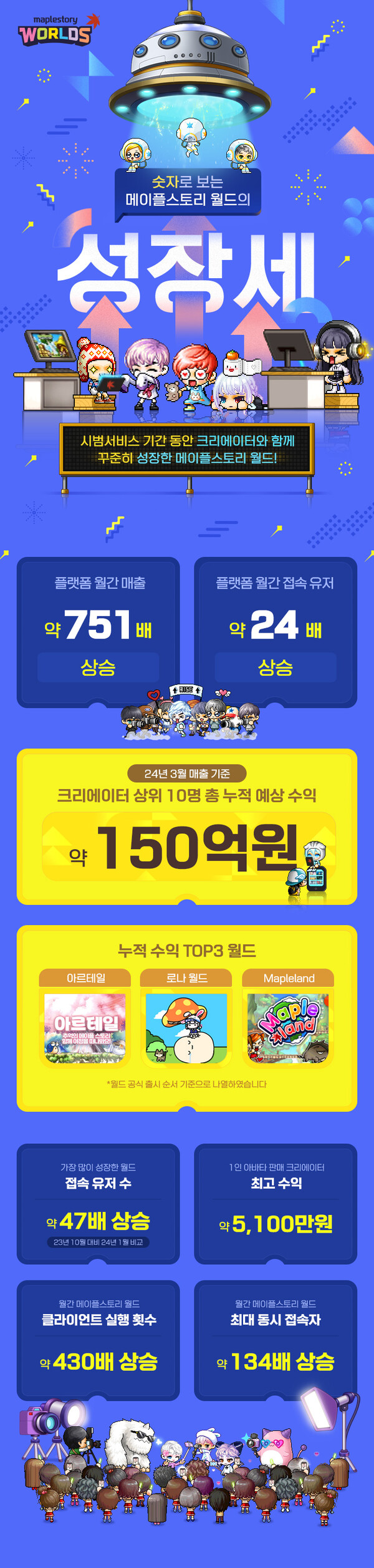 ‘메이플스토리 월드’는 플랫폼과 크리에이터가 함께 성장한 지난 시범 서비스 기간의 기록을 담은 인포그래픽을 공개했다. 전년도에 비해 ‘메이플스토리 월드’의 월간 최대 동시 접속자 수는 약 134배, 접속 유저수는 24배 상승했다. 클라이언트 실행 횟수도 430배나 증가했다.