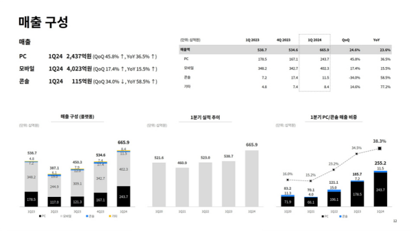 모바일 부분의 1분기 매출액은 4023억 원으로 전 분기 대비 17%, 전년 동기 대비 16% 성장했다. 펍지 모바일의 벤틀리 차량 스킨과 고급 등급의 레벨 업 총기가 큰 호응을 얻었으며, BGMI 서비스 재개도 모바일 매출 성장에 기여했다.