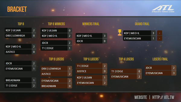 2024 ATL 시즌1 파이널 대진표에는 DAY 1~6 동안 좋은 성적을 거뒀던 DRX 로하이, T1 엣지, 아이뮤지션, 광동 프릭스 울산, JDCR, 머일과 LCQ에서 진출 티켓을 얻은 브래드맨, 저스티스 총 8명의 선수가 이름을 올렸다.
