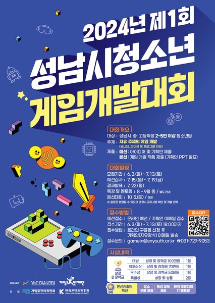 게임인재단(이사장 남궁훈, 이나정)과 성남시청소년재단(대표 최원기)이 공동 주최·주관하는 ‘2024년 제1회 성남시청소년게임개발대회’가 3일 온라인 접수를 시작했다.