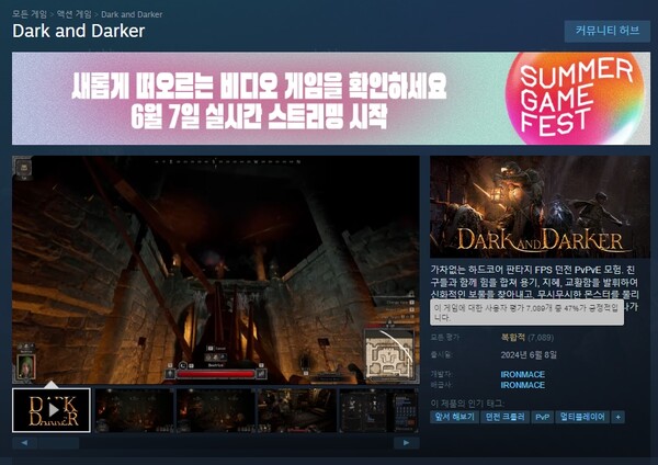 6월 10일 오후 4시 30분 기준 다크 앤 다커에는 7026개의 평가가 등록됐다. 해당 리뷰 중 47%만이 긍정 표를 던졌다. 평가 등급은 '복합적'이다. 한글로 작성된 평가 101개 기준으로는 36%만 긍정적이라고 답해 '대체로 부정적' 등급을 받았다.