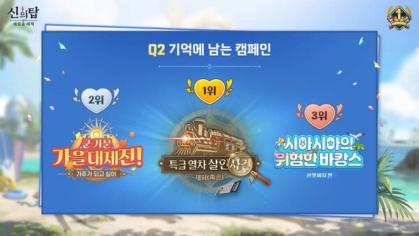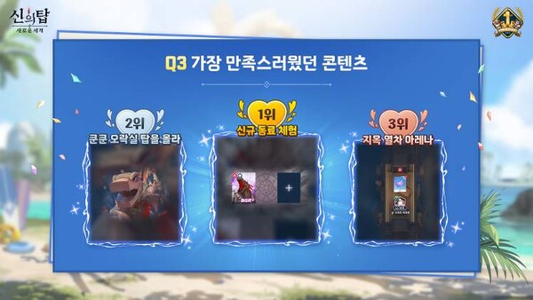 1위 신규 동료 체험, 2위 쿤쿤 오라실 탑을 올라, 3위 지옥 열차 아레나