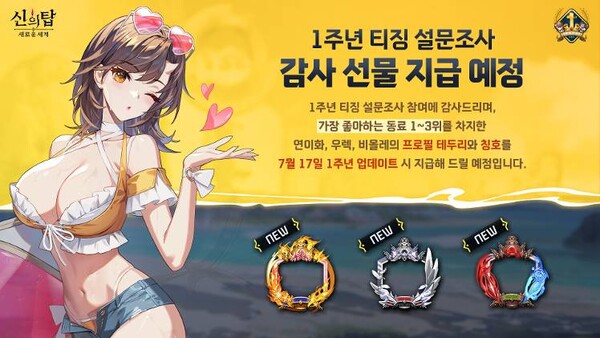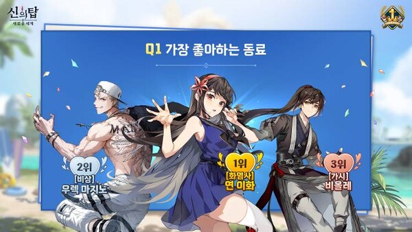 가장 좋아하는 동료 1~3위를 차지한 연이화, 우렉, 비올레의 프로필 테두리와 칭호를 7월 17일 1주년 업데이트 시 지급할 예정이다.