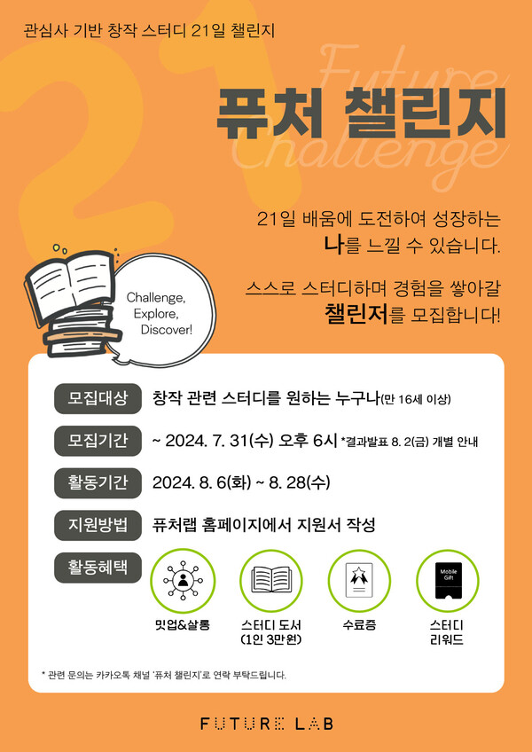 퓨처 챌린지 3기는 8월 6일 발대식을 시작으로 28일 수료식까지 약 3주간 활동한다. 참가자들 간의 네트워킹과 학습 목표 달성을 위한 워크숍 및 창작 활동과 관련된 도서 구입 지원비 등의 혜택이 제공될 예정이다.