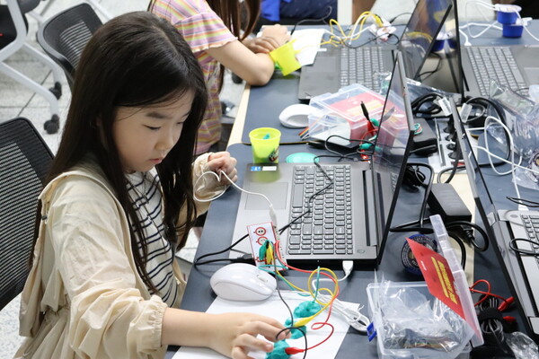 초등 저학년 교실은 하드웨어에 친숙하지 않은 아이들을 고려해 상호작용을 직관적으로 볼 수 있는 코딩 교구 '메이키메이키'로 수업을 진행했다. 엔트리 코딩의 기초만으로 직접 점프 게임과 나만의 악기를 만들어 보며 코딩과 기술에 대해 탐구하고 영감을 줄 수 있는 교육과정을 편성했다.