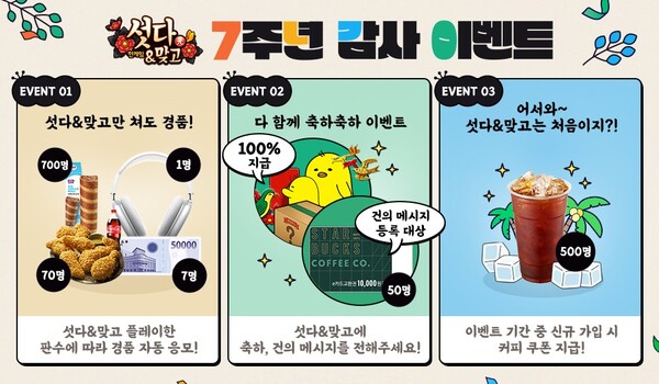 ‘한게임 섯다&맞고’가 준비한 7주년 기념 감사 이벤트는 축하 메시지 이벤트와 누적 플레이 이벤트, 신규 가입 이벤트까지 총 3종이다. 이벤트는 8월 12일까지 이어진다.