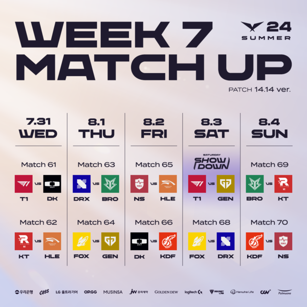 플레이오프 진출 경쟁이 치열해진 시점, 국내외 해설진들은 상위권 대결에 집중했다. 글로벌 해설진인 '아틀러스' 맥스 앤더슨과 '옥스' 댄 해리슨은 7주 차 T1 경기를 추천했다. T1은 7월 31일 디플러스 기아를 만나고 8월 3일 '새터데이 쇼다운'에서 젠지를 만난다.