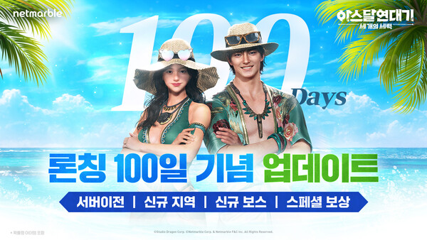 넷마블은 아스달 연대기 출시 100일을 기념한 출석 이벤트를 오는 8월 21일까지 진행, '희귀 영웅 정령 소환권', '4강 태고 신성패 선택상자' 등을 증정한다. 게임 진행하면서 획득한 증표를 이용해 다양한 보상으로 교환할 수 있으며, 인기 아이템들을 주는 '100일 성장 지원' 이벤트가 열린다.