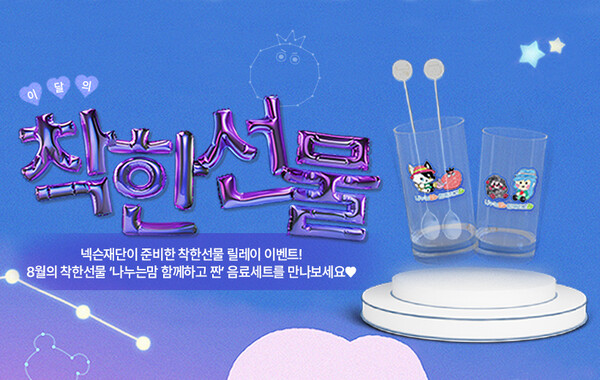 8월 릴레이 이벤트 선물은 마비노기와 푸르메재단의 컬래버레이션 굿즈 ‘나누는맘 함께하고 짠’ 음료 세트다. 한정판으로 제작된 음료 세트는 발달장애 직원들이 직접 그린 마비노기 캐릭터 유리잔 2개, 마비노기 캐릭터 실버 머들러 2개, 카페 무이숲 드립백 2세트로 구성돼 있다.