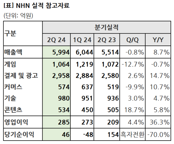 NHN(대표 정우진)은 연결기준 매출 5994억 원, 영업이익 285억 원을 뼈대로 한 2024년 2분기 실적을 발표했다. 매츨은 전년 동기 대비 8.7% 상승, 전 분기 대비로는 0.8% 감소한 금액이고 영업이익은 전년 동기 대비 36.3%, 전 분기 대비 4.4% 증가한 수치다.