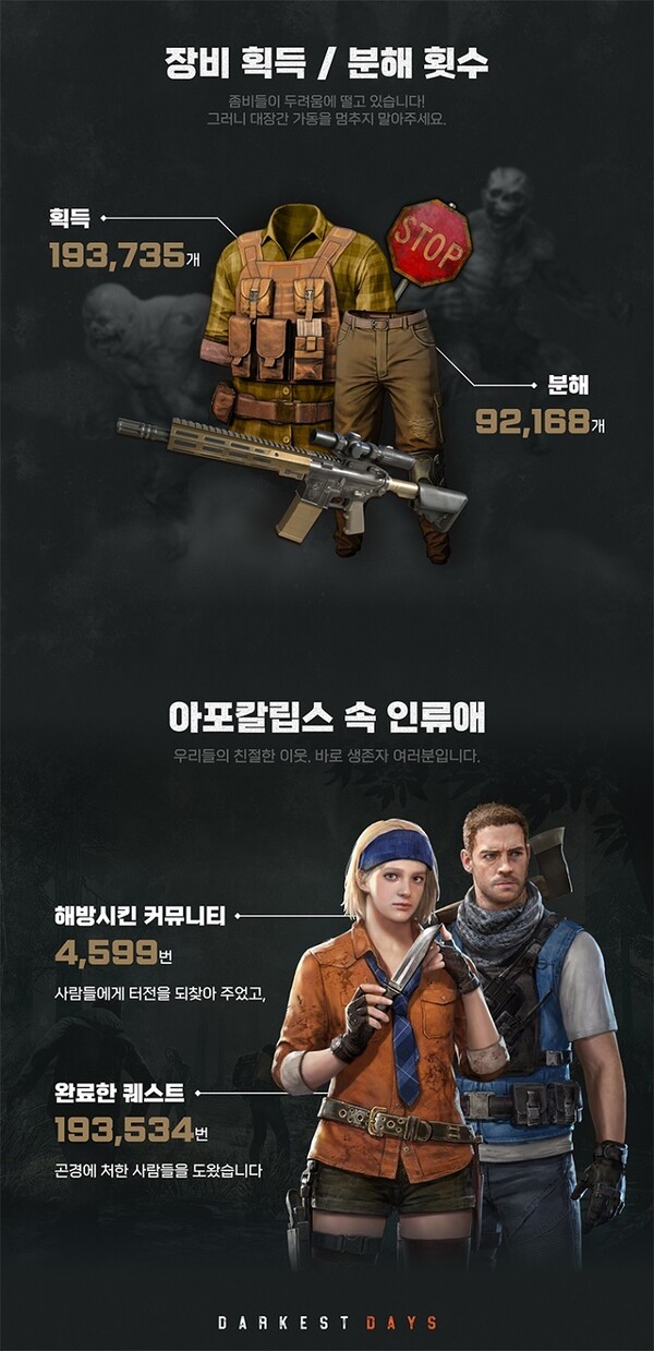 ‘다키스트 데이즈’는 2차 CBT 기간 동안 발생한 이색 기록을 담은 인포그래픽을 공식 커뮤니티에 공개하며 CBT 이후에도 이용자와의 소통을 강화해 나가고 있다.