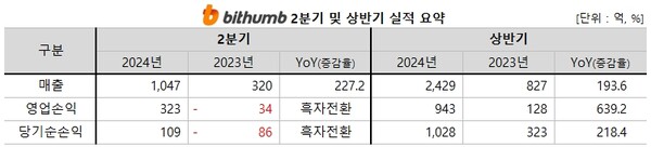 2024년 상반기 빗썸은 매출 2429억 원, 영업이익 943억 원, 당기순이익 1028억 원을 기록했다. 전년 동기와 비교해 매출 193.6%, 영업이익 639.2%, 당기순이익 218.4% 성장했다.