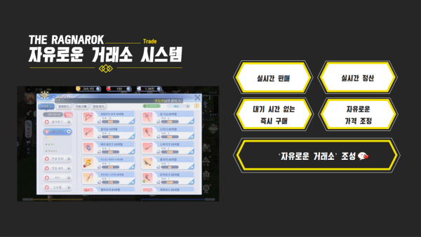기존 게임들은 등록, 판매, 입찰 등 대기 시간이 있다. 더 라그나로크는 즉시 등록 및 판매가 가능하며, 다이아로 거래하더라도 똑같이 판매 대금이 정산된다. 과금을 하지 않는 유저들도 자유롭게 거래하고 다이아를 수급할 수 있다. 노점이 없는 대신 실시간으로 거래할 수 있다.