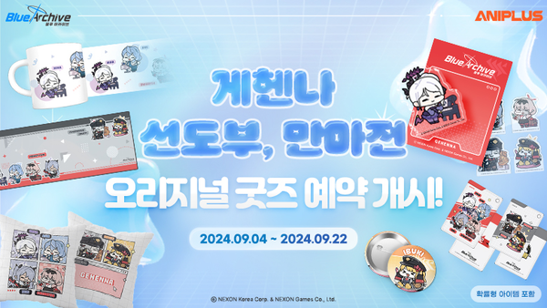 넥슨은 4일 "언제나 티격태격 바람 잘 날이 없는 게헨나 학원의 선도부와 만마전 학생들의 사랑스러운 일러스트가 담긴 공식 오리지널 굿즈를 공개한다"며 블루 아카이브 오리지널 굿즈 사전 예약 페이지를 오픈했다.