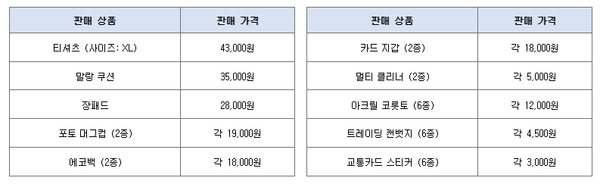 판매 리스트를 살펴보면 티셔츠(XL 사이즈), 말랑 쿠편, 장패드, 포토 머그컵(2종), 에코팩(2종), 카드 지갑(2종), 멀티 클리너(2종), 아크릴 코롯토(6종), 트레이딩 캔뱃지(6종), 교통카드 스티커(6종)이다.