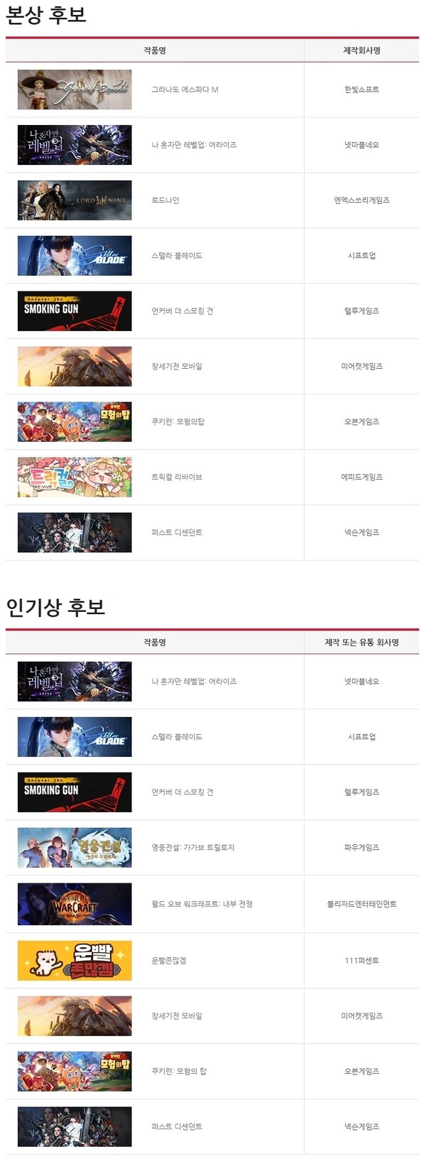 인기상 후보에는 넷마블 '나 혼자만 레벨업: 어라이즈', 시프트업 '스텔라 블레이드', 렐루게임즈 '언커버 더 스모킹 건', 파우게임즈 '영웅전설: 가가브 트릴로지', 블리자드 '월드 오브 워크래프트: 내부 전쟁', 111퍼센트 '운빨존많겜', 라인게임즈 '창세기전 모바일', 데브시스터즈 '쿠키런: 모험의 탑', 넥슨 '퍼스트 디센던트'가 포함됐다.