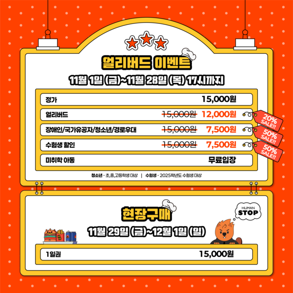 버닝비버 2024의 티켓 예매는 11월 28일까지 ‘네이버 플레이스’에서 이뤄진다. 버닝비버 1일권 티켓 정가는 1만 5000원이며, 얼리버드 행사 적용 가격은 1만 2000원이다.