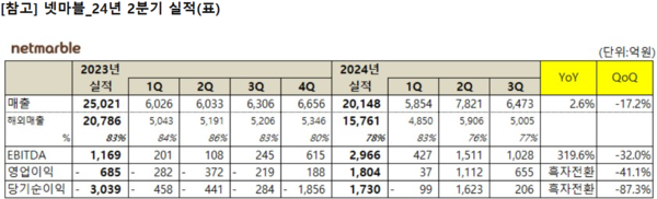 넷마블의 올해 3분기까지 누적 매출은 2조 148억원, 누적 EBITDA는 2966억원, 누적 영업이익은 1804억원으로 집계됐다.