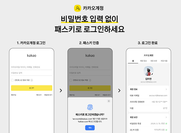 이번 도입으로 카카오계정 회원은 비밀번호 입력 없이도 카카오계정에 로그인할 수 있으며, 한 번 등록한 패스키는 iOS, Android 등 플랫폼 클라우드를 통해 자동으로 동기화돼 사용자가 보유한 다양한 기기에서 편리하게 사용할 수 있다.