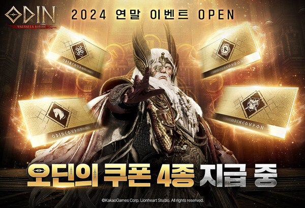 카카오게임즈는 연말을 기념해 오는 12월 25일까지 풍성한 보상을 제공하는 출석 이벤트를 연다. 게임에 접속하는 이용자 전원에게 ‘오딘의 아바타, 탈 것, 가호석, 룬‘ 4종의 쿠폰을 선물한다.