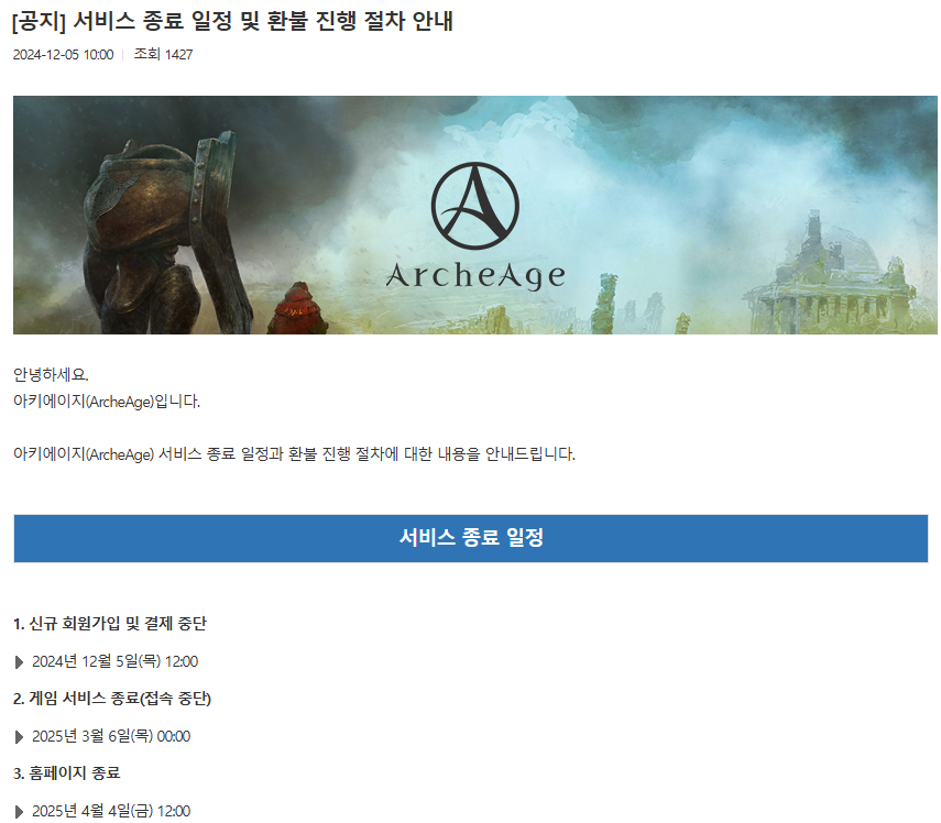 5일 엑스엘게임즈는 공식 홈페이지에서 아키에이지 서비스 종료를 발표했다. 신규 회원가입 및 결제가 모두 중지되고, 결제한 내역은 환불 조치가 이뤄진다.