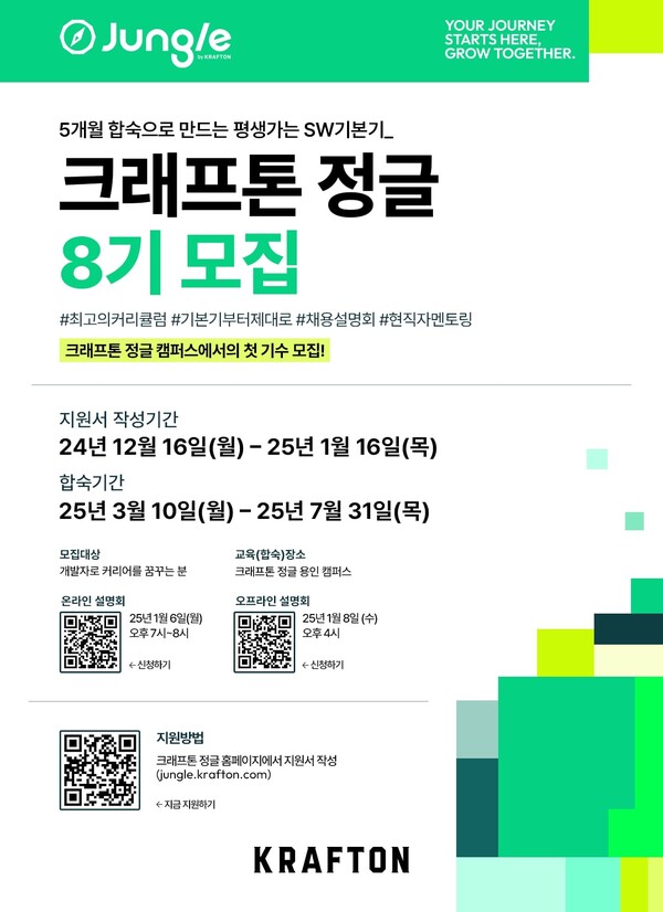 크래프톤(대표 김창한)이 디지털 인재 양성 프로그램 ‘크래프톤 정글’의 8기 참가자를 모집한다.