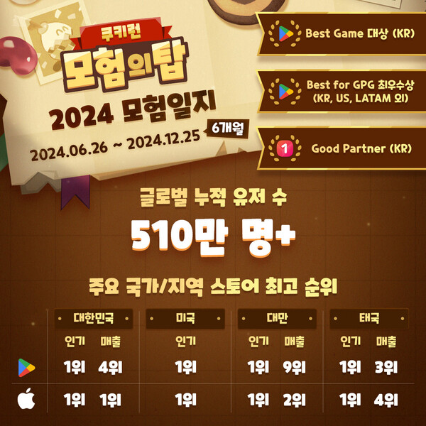 2024년 6월 26일 출시부터 12월 25일까지 약 6개월 동안 유저 510만 명 이상이 쿠키런: 모험의 탑을 즐겨왔다. 국내외에서 많은 사랑을 받으며 한국과 미국, 대만, 태국 등 구글플레이와 애플 앱스토어 인기 순위 1위에 모두 올랐다. 매출 순위에서도 한국 애플 앱스토어 1위, 대만 2위, 태국 4위 등 상위권에 진입하는 저력을 나타냈다.