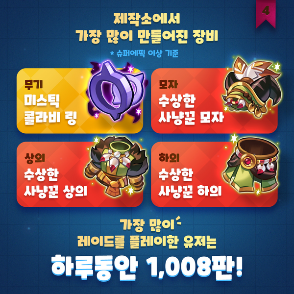제작소에서 가장 많이 만들어진 무기는 ‘콜라비맛 쿠키’의 전용 무기인 ‘미스틱 콜라비 링’이었다. 가장 많이 제작된 모자, 상의, 하의는 모두 ‘수상한 사냥꾼’ 세트에 속하며 기본 공격 피해, 치명타 확률, 치명타 피해 등 높은 공격 효율에 기대는 유저 선호도도 확인할 수 있었다.