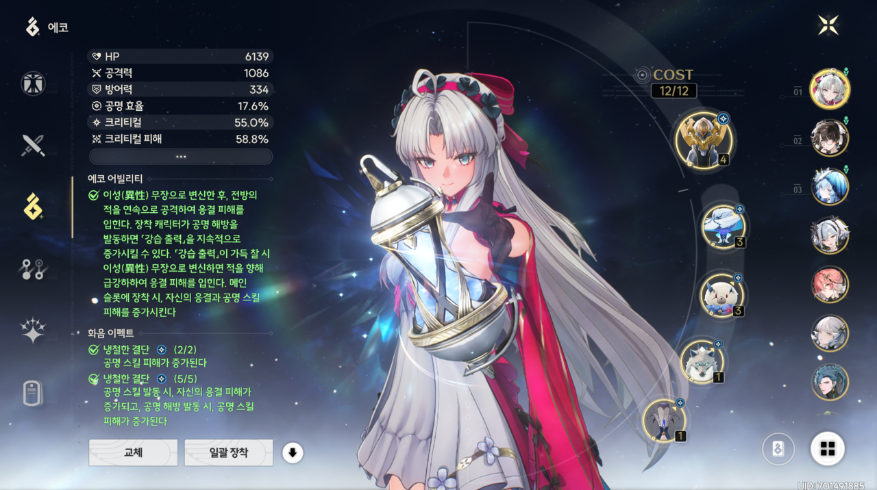 전용 무기는 크리티컬 피해가 높고 부동의 안개는 크리티컬 확률이 높다. 만약 전용 무기를 장착했다면 4코스트 옵션은 크리티컬을 추천한다. 적정 크리티컬 수치는 70% 이상이다. 현재는 에코를 아예 처음부터 파밍해야 하니 천천히 옵션을 맞춰가자.