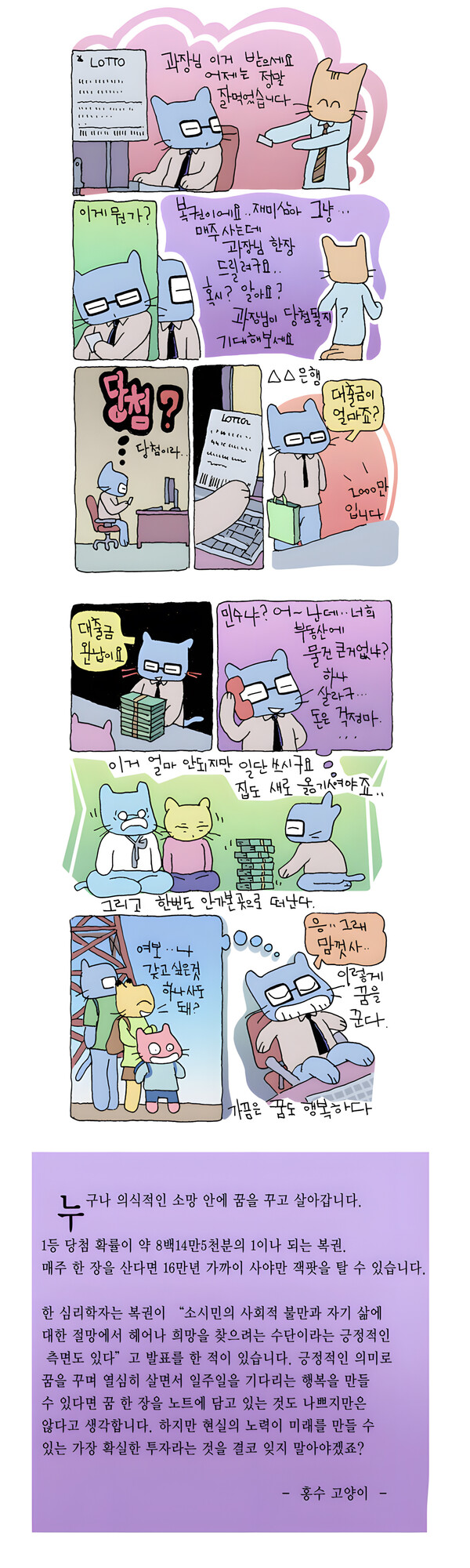 0 주홍수의 웹툰 나옹이네 3화 '복권, 돈주고 산 행복' 이 기사를 공유합니다 SNS 기사보내기 기사 공유하기 이 기사와 함께 보면 좋은 기사 주홍수의 웹툰 나옹이네 2화 '동물의 세계' 주홍수의 웹툰 나옹이네 1화 ‘어릴적 골목길’ 새해 주홍수 생활감성 만화 ‘나옹이네’가 온다 주홍수의 웹툰 나옹이네 5화 '별을 헤매는 밤' 주홍수의 웹툰 나옹이네 6화 '떠나라' 주홍수의 웹툰 나옹이네 7화 '할머니의 국수 한그릇' 주홍수의 웹툰 나옹이네 8화 '남의 이야기로 내행복 꾸며보기' 주홍수의 웹툰 나옹이네 9화 ‘놀아줘’ 박명기 기자 pnet21@gametoc.co.kr 다른기사 보기 저작권자 © 게임톡 무단전재 및 재배포, AI학습 및 활용 금지 개의 댓글 회원로그인 작성자 비밀번호 댓글 내용입력 댓글 정렬 최신순 추천순 답글순 BEST댓글 BEST 댓글 답글과 추천수를 합산하여 자동으로 노출됩니다. 닫기 더보기 댓글삭제 삭제한 댓글은 다시 복구할 수 없습니다. 그래도 삭제하시겠습니까? 비밀번호 댓글수정 댓글 수정은 작성 후 1분내에만 가능합니다. 본문 / 400 비밀번호 내 댓글 모음 닫기