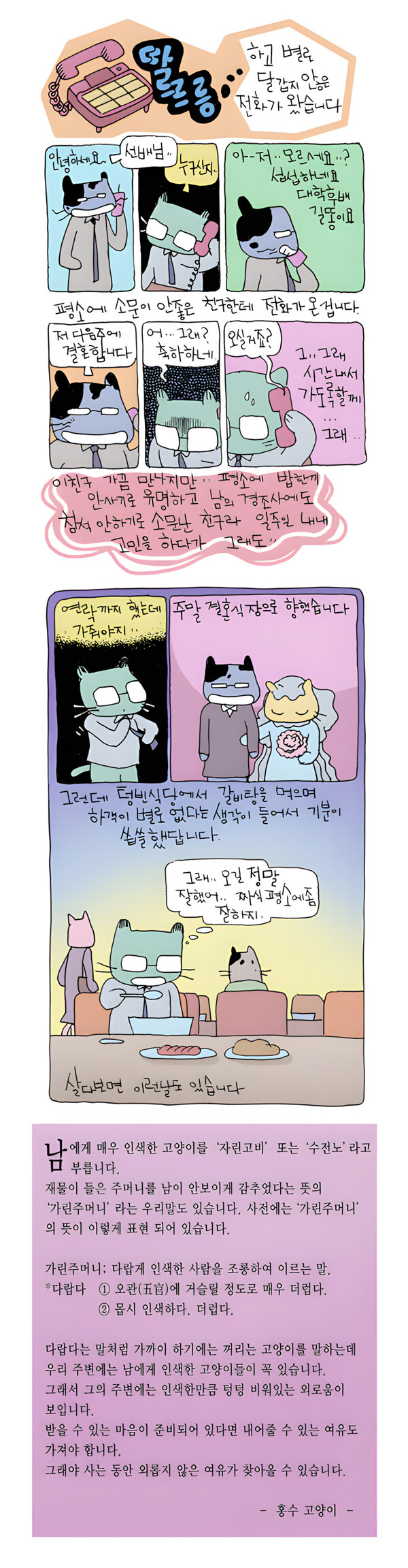 이 기사와 함께 보면 좋은 기사 주홍수의 웹툰 나옹이네 2화 '동물의 세계' 주홍수의 웹툰 나옹이네 1화 ‘어릴적 골목길’ 새해 주홍수 생활감성 만화 ‘나옹이네’가 온다 주홍수의 웹툰 나옹이네 5화 '별을 헤매는 밤' 주홍수의 웹툰 나옹이네 6화 '떠나라' 주홍수의 웹툰 나옹이네 7화 '할머니의 국수 한그릇' 주홍수의 웹툰 나옹이네 8화 '남의 이야기로 내행복 꾸며보기' 주홍수의 웹툰 나옹이네 9화 ‘놀아줘’