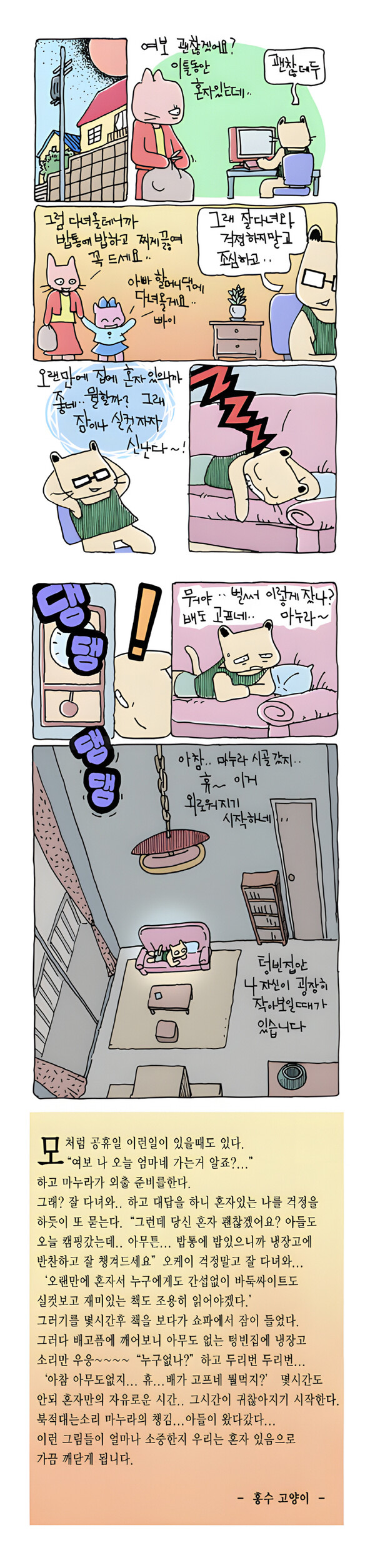 이 기사와 함께 보면 좋은 기사 주홍수의 웹툰 나옹이네 11화 '이름이란?' 주홍수의 웹툰 나옹이네 10화 ‘잘되면 내 탓, 안되면 남의 탓’ 주홍수의 웹툰 나옹이네 9화 ‘놀아줘’ 주홍수의 웹툰 나옹이네 8화 '남의 이야기로 내행복 꾸며보기' 주홍수의 웹툰 나옹이네 7화 '할머니의 국수 한그릇' 주홍수의 웹툰 나옹이네 6화 '떠나라' 주홍수의 웹툰 나옹이네 5화 '별을 헤매는 밤' 주홍수의 웹툰 나옹이네 4화 '예고받지 않은 초대장'