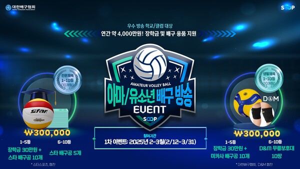 SOOP은 대한배구협회와 함께 아마추어 및 유소년 배구 생태계 활성화를 위한 지원 프로그램을 확대한다고 11일 밝혔다. SOOP과 대한배구협회는 지난해부터 아마추어와 유소년 배구를 지원하며 생태계 활성화에 협력해오고 있다.