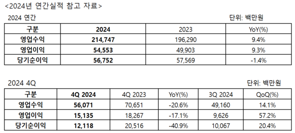 2024년 영업수익과 영업이익은 2147억 원과 545억 원으로 전년 대비 각각 9.4%, 9.3% 성장했다. 당기순이익은 567억 원으로 1.4% 줄었다.