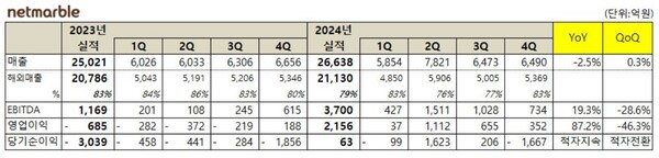 넷마블(대표 권영식, 김병규)은 2024년 4분기 연결기준으로 매출 6490억 원(YoY -2.5%, QoQ 0.3%), EBITDA(상각전 영업이익) 734억 원(YoY 19.3%, QoQ -28.6%), 영업이익 352억 원(YoY 87.2%, QoQ -46.3%), 당기순손실 1667억 원(YoY 적자지속, QoQ 적자전환)을 기록했다고 13일 밝혔다.