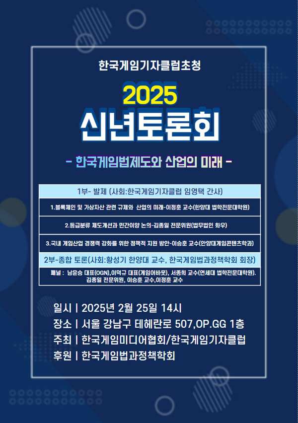 한국게임미디어협회 이택수 회장은 ”2025년을 맞아 게임산업의 발전을 뒷받침할 수 있는 정책의 방향성 및 규제와 현실의 괴리에 대해 업계 관계자들이 함께 논의하고 의견을 나누기 위해 이번 토론회를 기획했다“며 “국내 게임업계의 상황을 진단하고 미래에 대한 인사이트를 얻을 기회인 만큼 많은 관심을 부탁드린다”고 밝혔다.