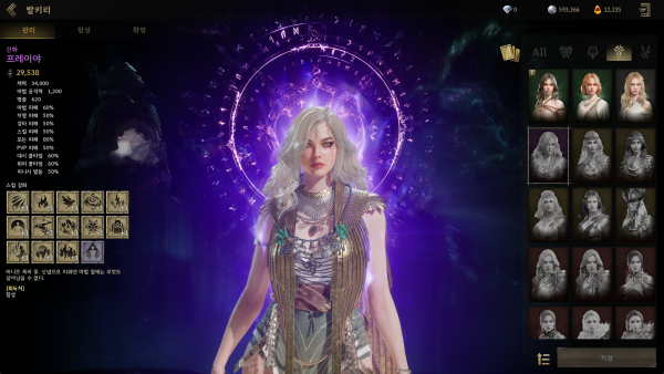 확률 역시 마찬가지다. 발키리 기준으로 가장 높은 등급인 '신화'는 전설 등급 합성으로만 얻는다. 공격력, 명중, 스킬 피해 등 좋은 옵션 수치가 높은 전설 등급 등장 확률은 0.00075%에 불과하다.