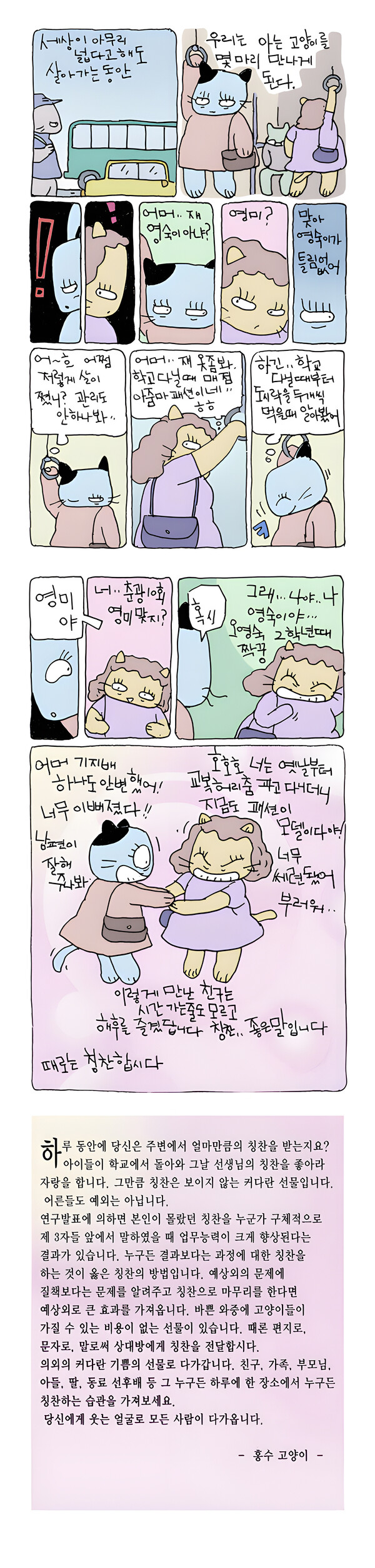 이 기사와 함께 보면 좋은 기사 주홍수의 웹툰 나옹이네 19화 ‘고양이밥' 주홍수의 웹툰 나옹이네 18화 ‘결혼상대’ 주홍수의 웹툰 나옹이네 17화 ‘뉴스’ 주홍수의 웹툰 나옹이네 16화 ‘감동을 주는 법’ 주홍수의 웹툰 나옹이네 15화 ‘신을 믿는 고양이’ 주홍수의 웹툰 나옹이네 14화 ‘좋은 상사란?’ 주홍수의 웹툰 나옹이네 13화 ‘나 홀로 집에’ 주홍수의 웹툰 나옹이네 12화 '롤라이35'
