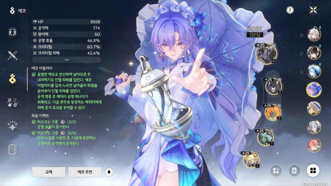 결론적으로 공명 스킬이 주력인 인멸 속성 피해 딜러가 추후 등장한다면 완벽한 고점을 볼 수 있는 공명자다. 그러나 현재도 쓰임새가 분명하며 자체 성능도 좋은 편이라 뽑아도 후회할 일은 없다.
