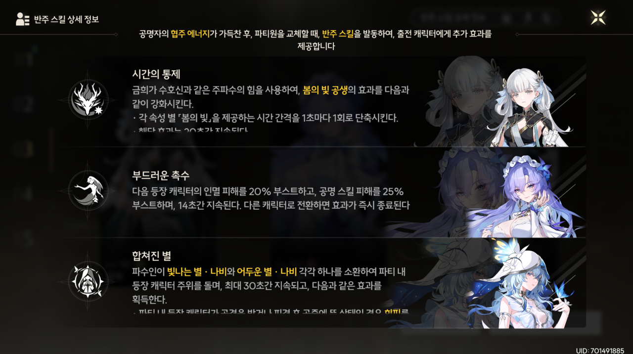 기본 딜 사이클은 위에서 말한 것과 달라지지 않는다. 만약 상기 사이클을 모두 수행했는데도 협주 게이지가 모두 차지 않았다면 기본 공격을 몇 번 더 사용하면 된다. 아마 최대치 직전까지 협주 게이지가 확보되기에 오랜 시간이 걸리지는 않는다.