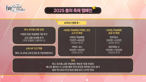 2부에서는 2025 서머 페스티벌 소식이 전해졌다. 넷마블은 봄, 여름 알찬 업데이트로 기대감을 심었는데 페그오 17차 라이브 방송 주요 내용은 아래와 같다.