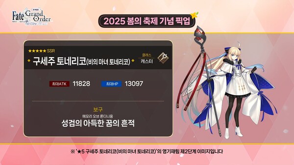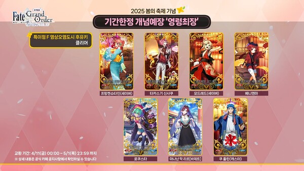 1부에서는 2025 봄의 축제 소식이 전해졌다. 해당 이벤트에서는 성정석, 영맥석 등 다양한 보상이 제공되고 구세주 토네리코, 노크나레아 등 다양한 서번트가 픽업으로 등장한다.