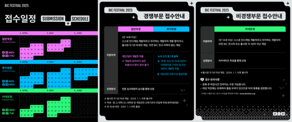BIC 2025는 8월 15일부터 17일까지 부산 벡스코 제1전시장에서 오프라인으로 열린다. 온라인 페스티벌은 8월 8일부터 8월 29일까지 공식 누리집을 통해 운영될 예정이다. 참가자는 오프라인과 온라인 전시 모두에 참여할 수 있다.