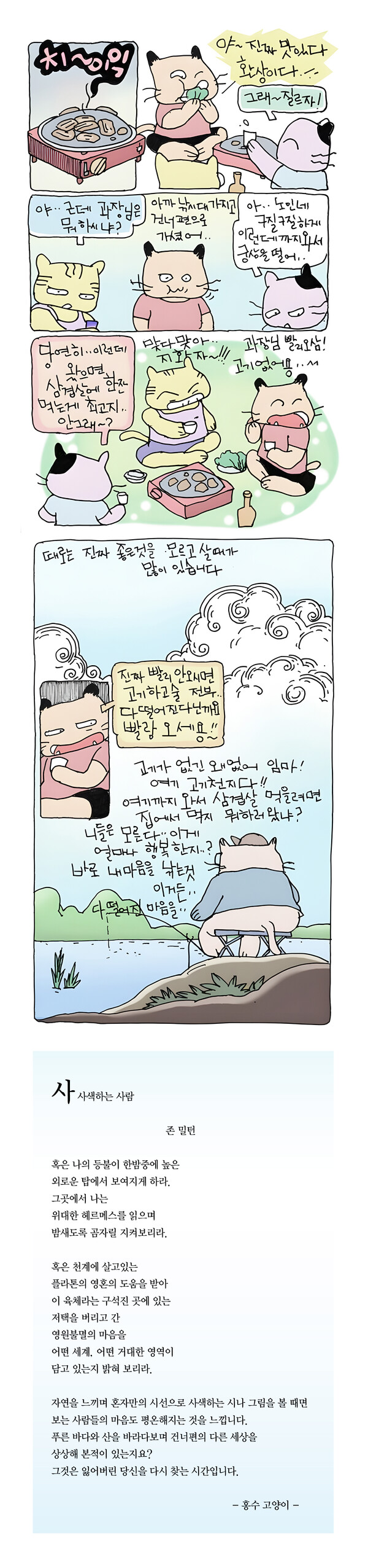 이 기사와 함께 보면 좋은 기사 주홍수의 웹툰 나옹이네 33화 ‘추억이 방울방울’ 주홍수의 웹툰 나옹이네 32화 ‘천생연분’ 주홍수의 웹툰 나옹이네 31화 ‘너 커서 뭐가 될래’ 주홍수의 웹툰 나옹이네 30화 ‘싫어하는 직장상사’ 주홍수의 웹툰 나옹이네 29화 ‘포기하고 싶을 때’ 주홍수의 웹툰 나옹이네 28화 ‘나는 어떤 고양이’ 주홍수의 웹툰 나옹이네 27화 ‘부탁’ 주홍수의 웹툰 나옹이네 26화 ‘어머니의 마음’