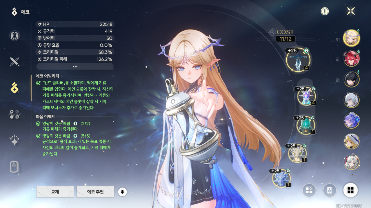 카르티시아가 딜러로 등장했기에 습관적으로 공격력% 에코를 강화하는 경우가 자주 보인다. 다시 한번 말하지만 1코스트 주 옵션은 체력%다. 소중한 재화를 엄한 곳에 쓰지 않도록 주의하자.