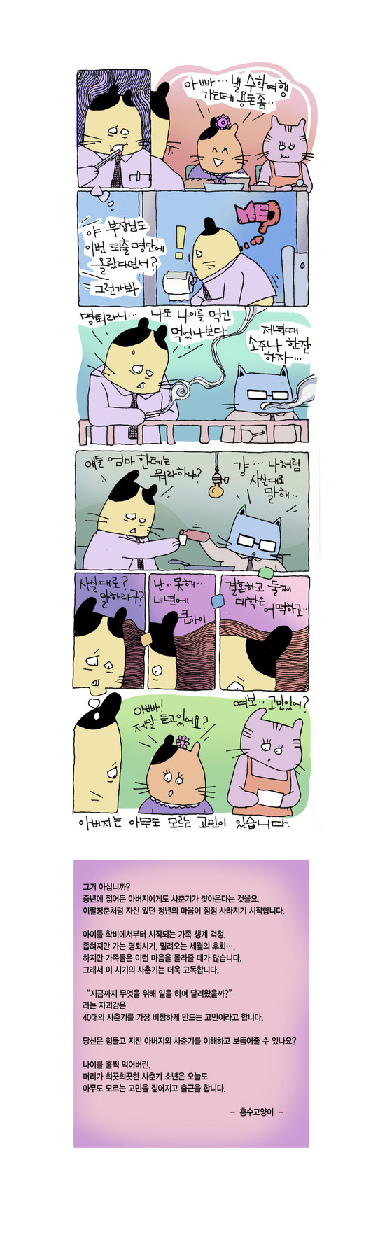 이 기사와 함께 보면 좋은 기사 주홍수의 웹툰 '나옹이네' 54화 '긍정과 부정 사이' 주홍수의 웹툰 나옹이네 53화 ‘감동이란 어떤 것?’ 주홍수의 웹툰 나옹이네 52화 '추억' 주홍수의 웹툰 나옹이네 51화 ‘후회만들기’ 주홍수의 웹툰 나옹이네 49화 ‘이상형’ 주홍수의 웹툰 나옹이네 48화 '고향' 주홍수의 웹툰 나옹이네 47화 '24시간' 주홍수의 웹툰 나옹이네 46화 '지키지 못할 약속'